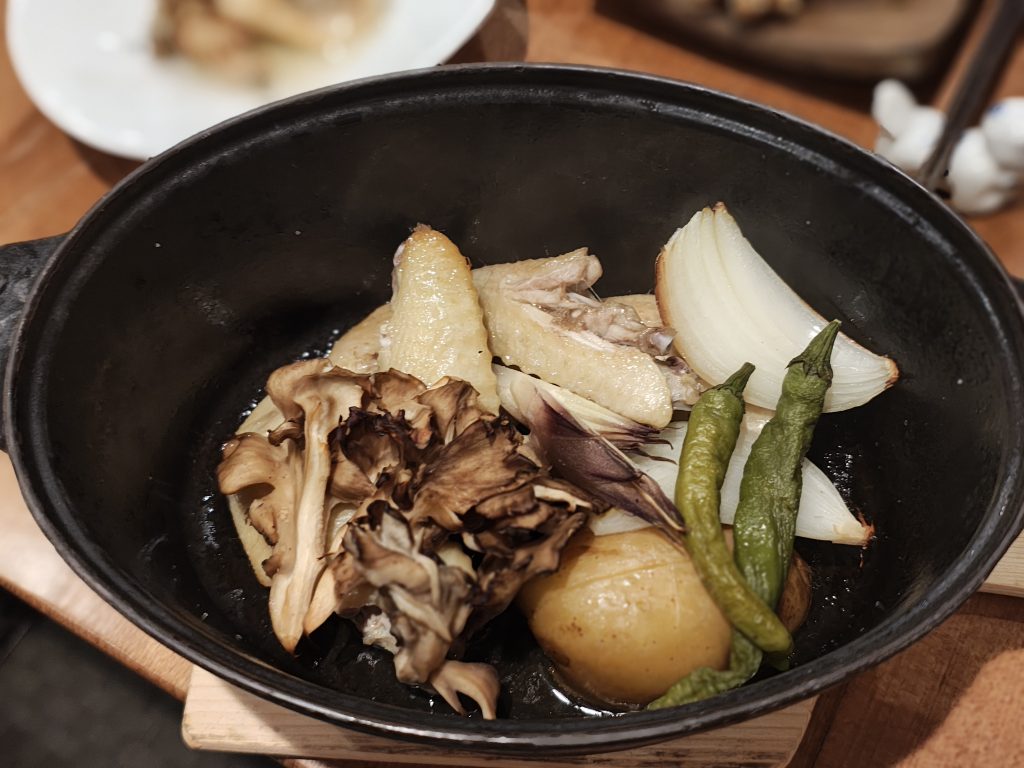 比内鶏の手羽と舞茸をいろいろなお野菜とストウブ鍋で蒸し焼きにして、香りと味を楽しんでいただきます🍄🟫🐓